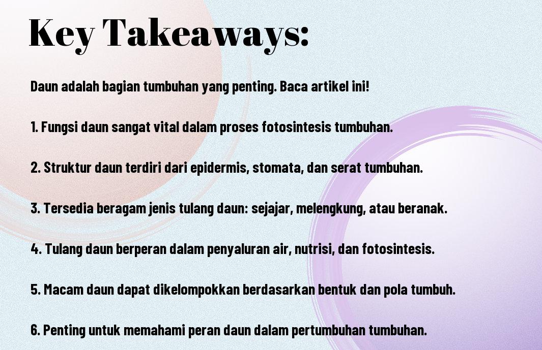 Daun adalah bagian dari tumbuhan yang sangat penting dalam proses fotosintesis. Dalam tumbuhan, daun memiliki fungsi untuk menangkap energi matahari dan mengubahnya menjadi makanan melalui proses fotosintesis. Struktur daun terdiri dari berbagai bagian seperti epidermis, stomata, dan kloroplas. Ada berbagai macam tulang daun, seperti paralel, menyirip, dan retikuler. Memahami dengan baik tentang daun akan membantu kita untuk lebih menghargai kehidupan tumbuhan di sekitar kita.