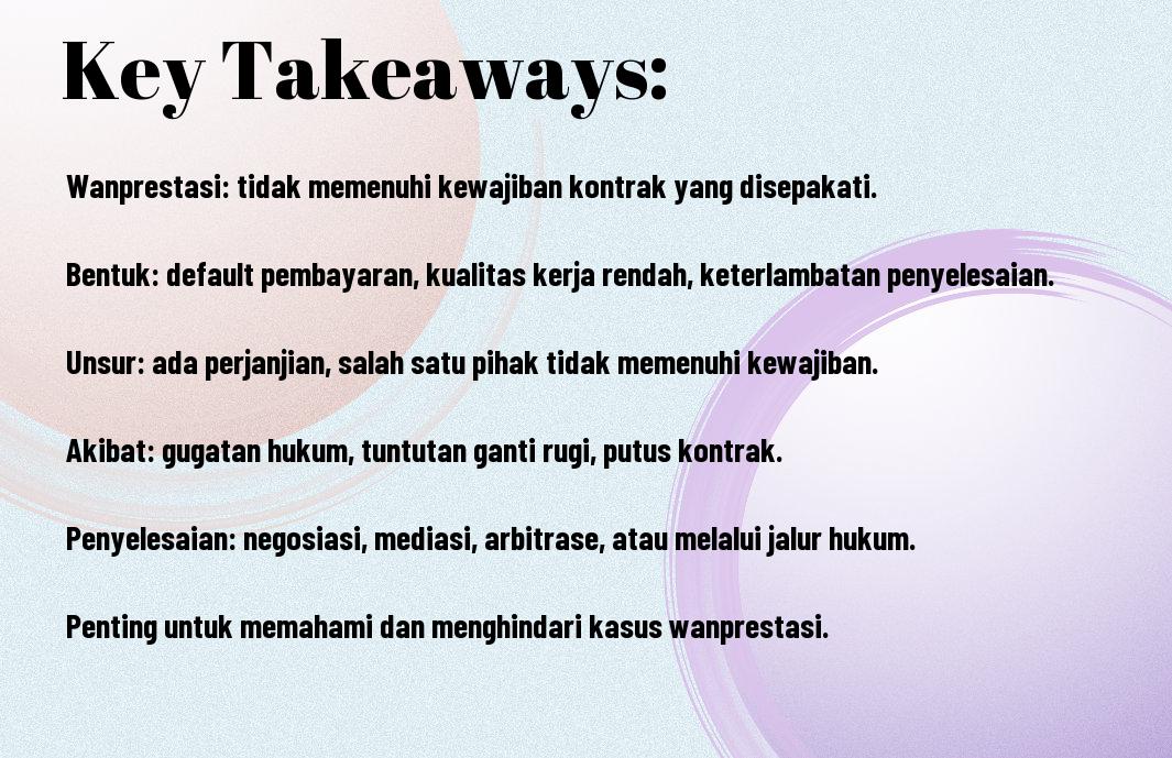 Dalam hukum, wanprestasi adalah isu yang kompleks dan memerlukan pemahaman yang mendalam. Para pihak yang terlibat dalam suatu kontrak perlu memahami hak dan kewajiban masing-masing agar dapat mencegah terjadinya wanprestasi. Pengetahuan tentang prosedur penyelesaian sengketa juga penting untuk mengatasi masalah secara efisien dan adil bagi semua pihak yang terlibat.