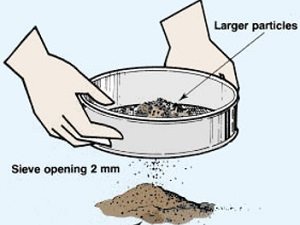 Pengayakan: pemisahan zat-zat padat berdasarkan perbedaan ukuran partikel zat, di mana partikel-partikel yang berukuran lebih kecil dapat lolos melewati lubang ayakan sedangkan partikel-partikel yang lebih besar akan tertahan pada ayakan. Metode ini banyak digunakan untuk keperluan analisis tanah.